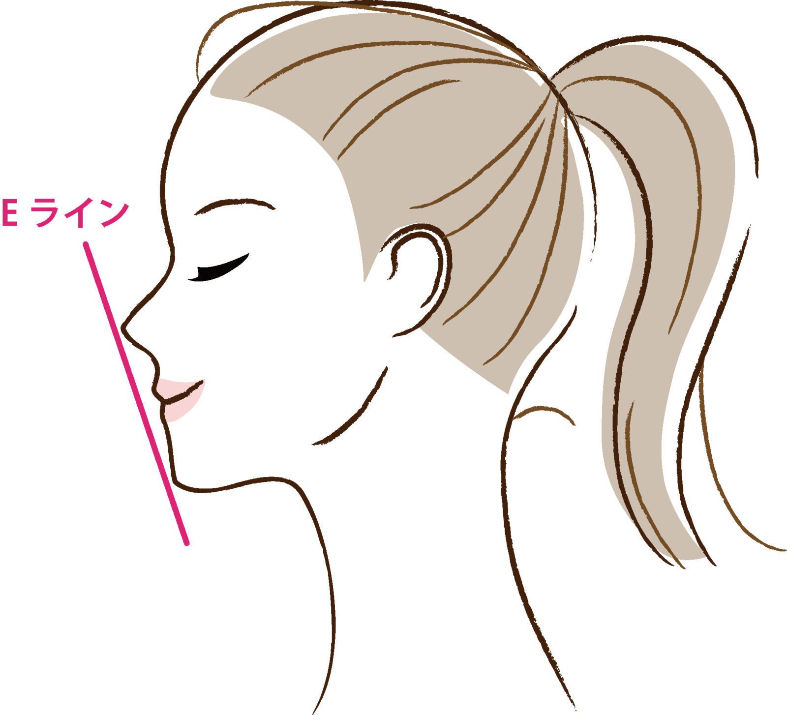 Eラインとは、下顎の突端部と鼻先を結ぶ線のことで、唇がこの線の中に収まっていることが、美しい横顔とされています。しかし、出っ歯や受け口、叢生(歯の乱れ)が原因で、Eラインから唇がはみ出すことがあります。矯正治療で、これを整えることが可能です。
