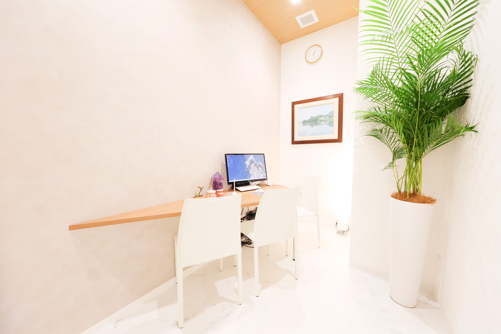 治療前のカウンセリングや治療内容のご説明に使用するスペースです。周囲から仕切られた空間にあるため、話し声が周囲に漏れることはございません。プライバシーは守られております。治療費や治療期間のことなど、不安なことは何でも気兼ねなくご相談ください。